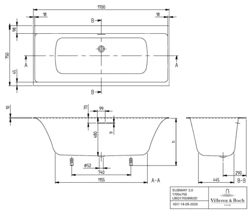 Villeroy & Boch Subway 3.0 rectangular bathtubs, including bath pedestal, 1700x750x480mm