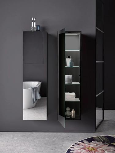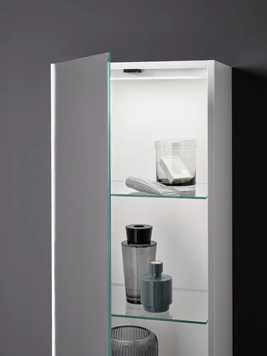 Armario alto emco evo, 1500mm, puerta doble espejo, herraje basculante, 4 estantes de cristal, luz interior LED