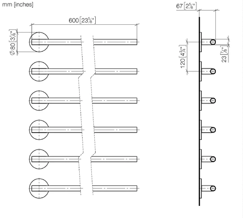 Calienta toallas Dornbracht, 6 pliegues, proyección derecha, anchura 610mm