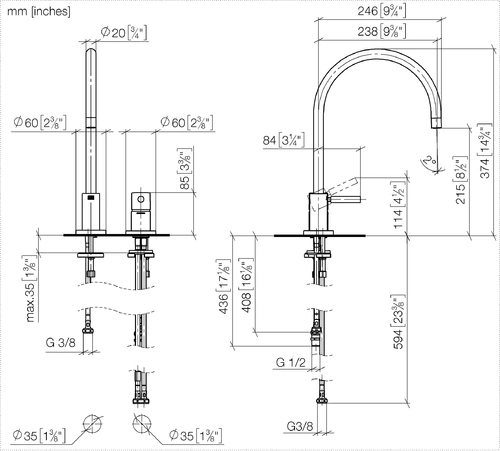 Dornbracht TARA Mezclador de dos agujeros con rosetas individuales, proyección 236mm