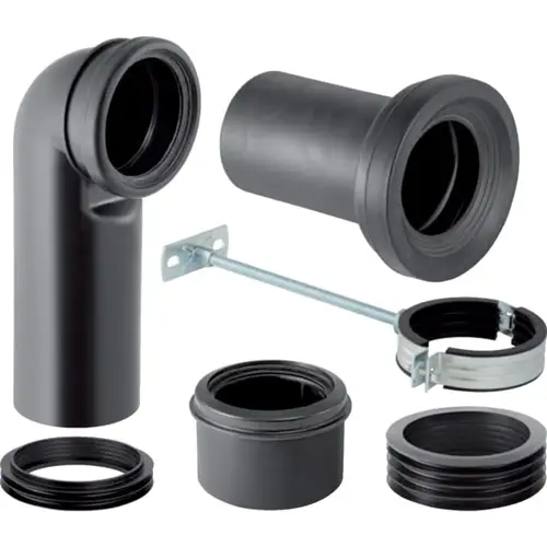 El volumen de suministro de este versátil juego incluye un tubo de conexión de robusto material PP con un diámetro de 90 mm y un codo de conexión de PE-HD, también con un diámetro de 90 mm. Además, el juego incluye un manguito de transición de PE-HD, con diámetros de 90 y 110 mm. De este modo se garantiza una conexión óptima entre el inodoro y el desagüe.
