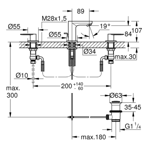 Grohe Eurosmart Cosmopolitan Mezclador de lavabo de 3 agujeros, 89 mm de proyección, juego de desagüe