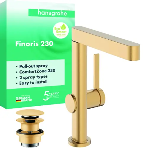 hansgrohe Finoris mezclador monomando de lavabo 230 con ducha extraíble, 2 tipos de chorro y desagüe con apertura a presión, 178 mm de proyección