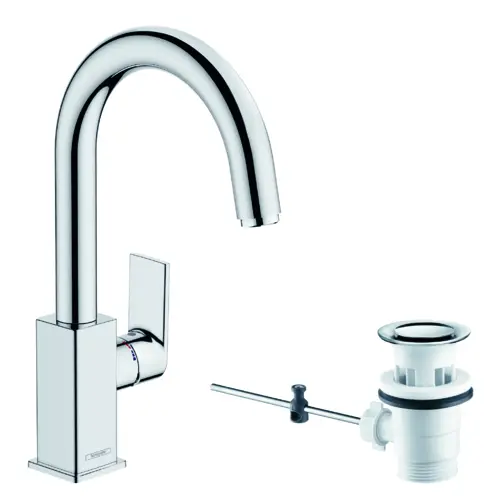 - 1x mezclador monomando de lavabo con caño giratorio y desagüe automático, cromado