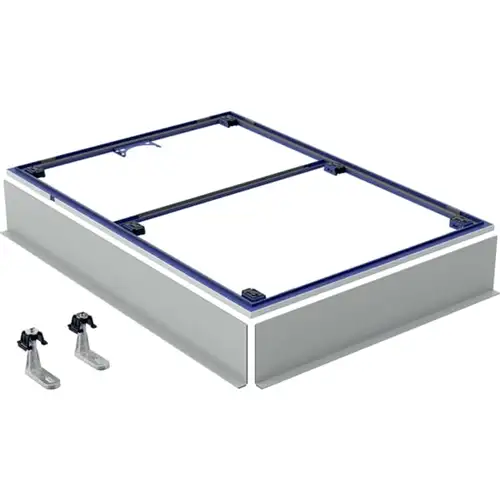 El volumen de suministro del marco de montaje Geberit Setaplano incluye dos paneles de encofrado prefabricados y dos pies. Sin embargo, para una instalación completa, necesitará pedir componentes adicionales. Esto incluye el plato de ducha Setaplano y el desagüe de plato de ducha Geberit con 6 pies, que está disponible en dos versiones con alturas de barrera de agua de 50 mm y 30 mm. También puede ser útil la conexión de desagüe Geberit para una instalación empotrada en el suelo.