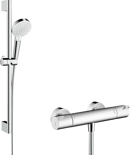 Sistema de ducha de superficie hansgrohe Crometta Vario con Ecostat 1001 CL termostato y barra de ducha 65 cm, blanco/cromo