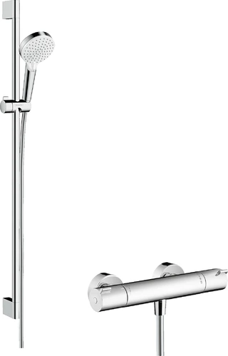 Sistema de ducha de superficie hansgrohe Crometta Vario con Ecostat 1001 CL termostato y barra de ducha de 90 cm, blanco/cromo