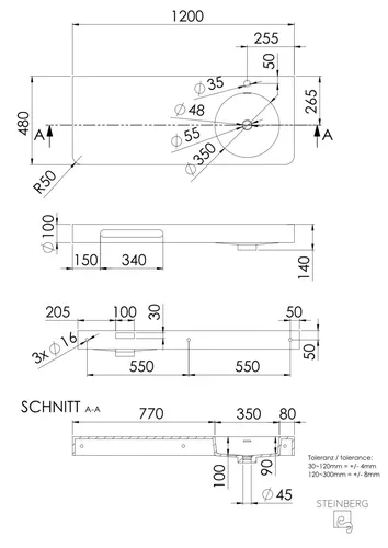 Steinberg Serie 449 Lavabo mural, 1200x480mm, toallero a la izquierda, SOLIDSurface, 1 agujero para grifo, con rebosadero