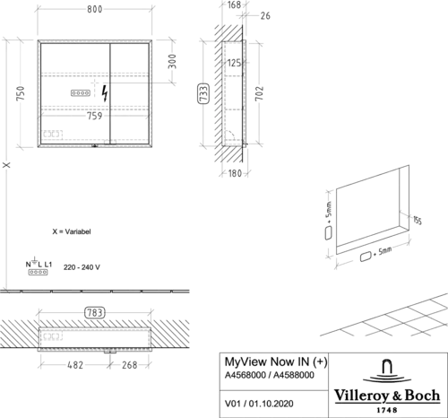 Armario con espejos empotrado My View Now de Villeroy & Boch, 2 puertas, con iluminación, con interruptor de encendido/apagado, compatible con Smart Home, 800x750x167,5mm