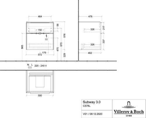 Villeroy & Boch Subway 3.0 armoire sous lavabo, éclairage LED, 2 tiroirs, 572x576x478mm