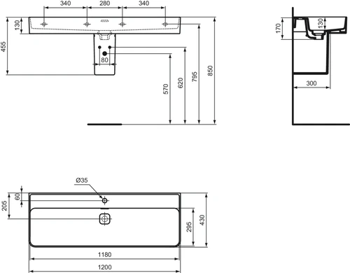 • Dimensions extérieures L x P x H : 1200 x 430 x 170 mm