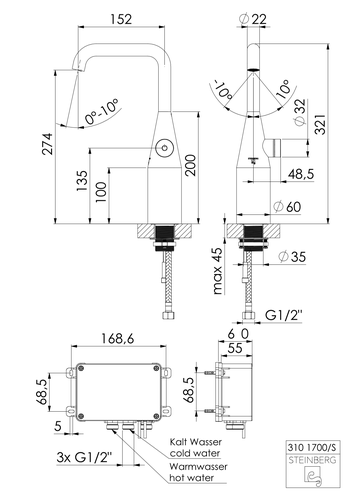 Steinberg Série 310 Iconic, robinetterie électronique pour lavabo, sans vidage, saillie 152mm, hauteur 321mm