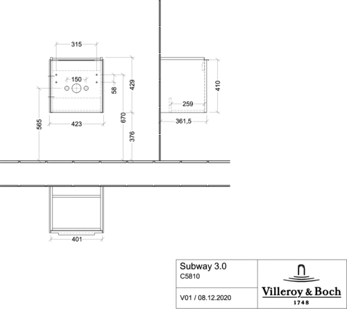 Villeroy & Boch Subway 3.0 armoire sous lavabo, 1 porte butée à gauche, 423x429x378mm