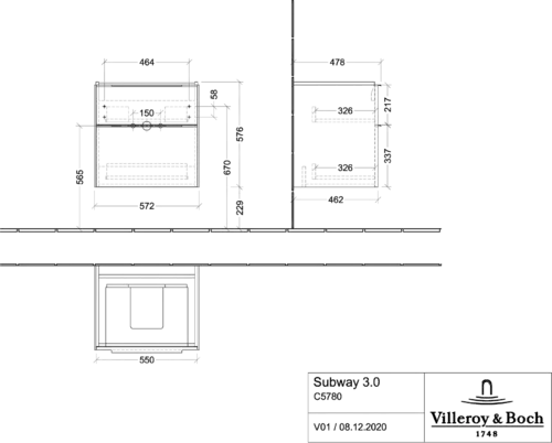 Villeroy & Boch Subway 3.0 armoire sous lavabo, 2 tiroirs, 572x576x478mm