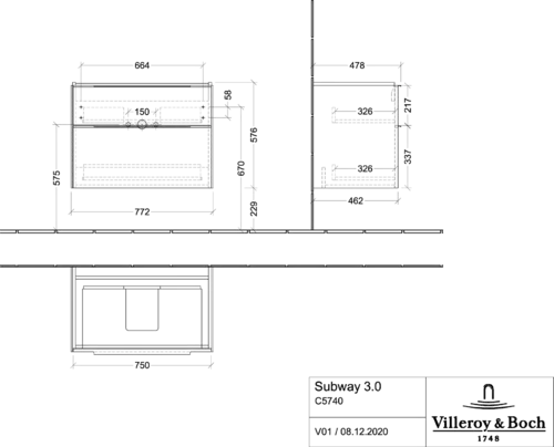 Villeroy & Boch Subway 3.0 armoire sous lavabo, 2 tiroirs, 772x576x478mm