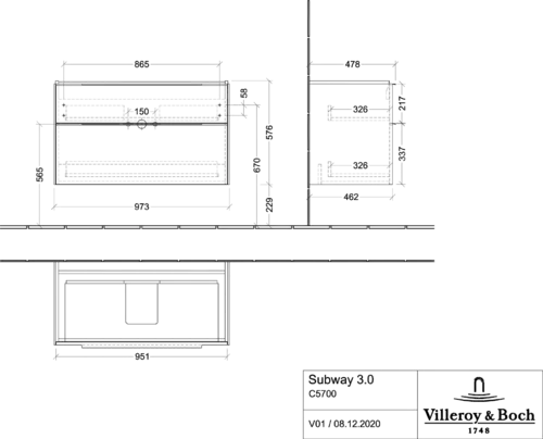 Villeroy & Boch Subway 3.0 armoire sous lavabo, 2 tiroirs, 973x576x478mm
