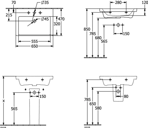 Villeroy & Boch Subway 3.0, lavabo rectangulaire, sans percement pour la robinetterie, sans trop-plein, 650x470mm