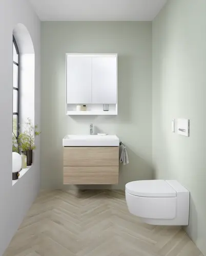 - Für die Installation von Unterschrank und Waschtisch wird ein Geberit Waschbeckenanschluss, Raumsparmodell benötigt (separat zu bestellen)