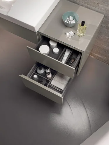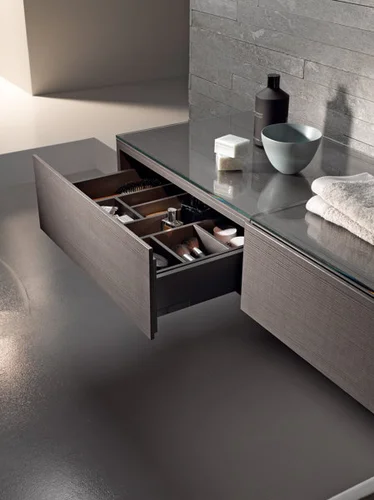 Mit diesem Schubladeneinsatz optimierst Du nicht nur Deinen Stauraum, sondern erhöhst auch das Ambiente Deines Badezimmers. Der sculturagraue Farbton und die attraktive Melamin-Holzstruktur setzen in jeder Schublade einen stilvollen Akzent.