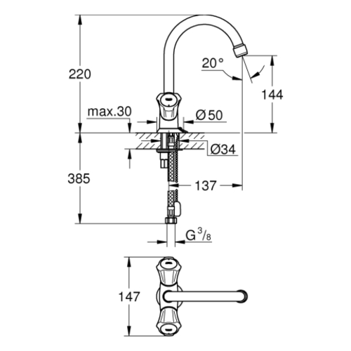 GROHE Costa Waschtisch-Einlochbatterie, Ausladung 137mm, schwenkbar, Zweigriff, versenkbare Kette