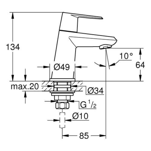 Grohe Eurodisc-Cosmopolitan Standventil, XS-Size, Ausladung 85mm, ohne Ablaufgarnitur