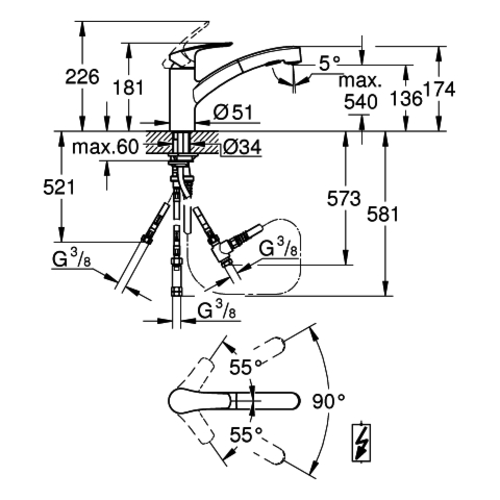 Mezclador monomando de fregadero Grohe Eurosmart, baja presión, 227 mm de proyección, doble rociador extraíble