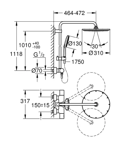 Die Rainshower Cosmopolitan 310 Metall-Kopfbrause ist das Herzstück dieses Systems. Sie verfügt über ein Metallgehäuse mit einem Kugelgelenk, das einen Drehwinkel von ± 15° ermöglicht, um eine optimale Ausrichtung der Brause zu gewährleisten. Dies garantiert dir die perfekte Grohe Regendusche, jeden Tag.