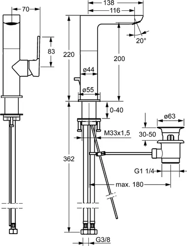 HANSA HANSALIGNA Waschtischarmatur, seitenbedient, mit Ablaufgarnitur, Ausladung: 116mm, chrom