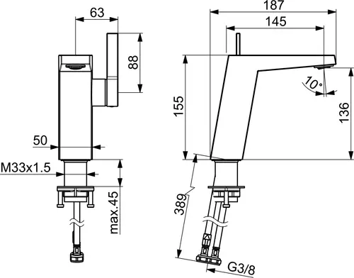 - zonder uitloop rechtstreeks in de uitloop van de kraan geschroefd, draaibaar