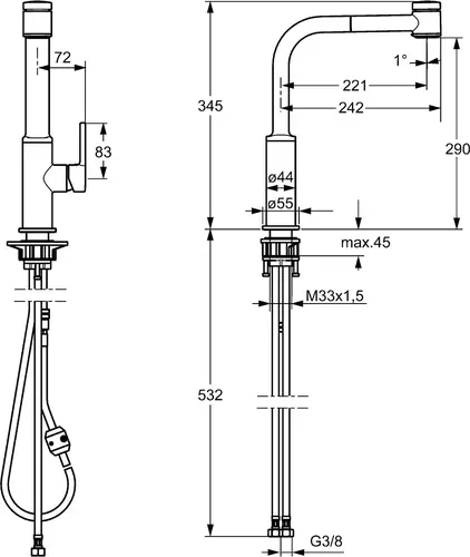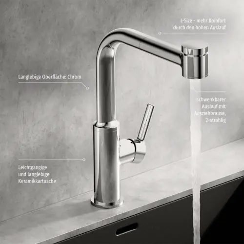 - schwenkbarer Auslauf, Schwenkbereich: 150° (360°)