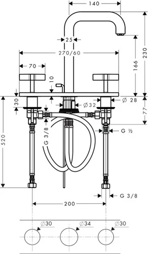 hansgrohe AXOR Citterio 3-hole basin mixer 170, drain set, spout 140mm, cross handles, plate