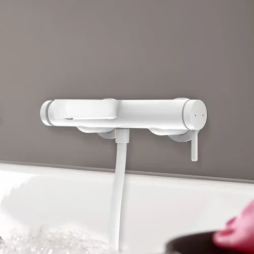 - An den Wasserauslass für den Duschkopf passt jeder handelsübliche Duschschlauch (Größe G ½