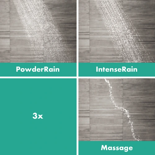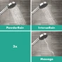 - Abwechslung durch drei Strahlarten: sanft einhüllender PowderRain, kräftiger Regenstrahl IntenseRain und entspannender Massagestrahl