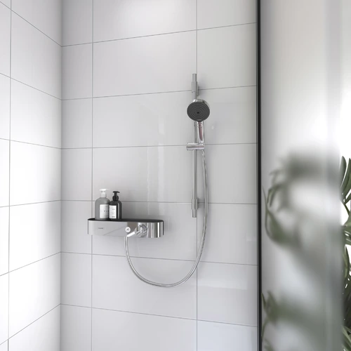 Das Hansgrohe ShowerTablet passt an vorhandene Standard-S-Anschlüsse (Größe G ½. DN15) und ist somit leicht zu installieren. Der integrierte Brausehalter auf der rechten Seite des Thermostats sorgt dafür, dass der Duschkopf stets bequem erreichbar ist.