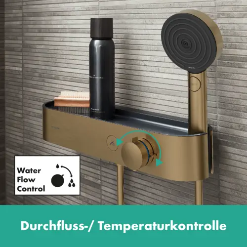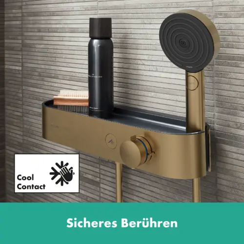 Die einfache Wassersteuerung mit klar gekennzeichneten Tasten ermöglicht es dir, das Wasser ein- und auszuschalten, ähnlich wie bei einem Lichtschalter. Die formschöne Ablage in modernem Graphitschwarz bietet nicht nur Platz für Shampoo und Duschgel, sondern wertet auch das Erscheinungsbild deines Badezimmers auf. Die Oberfläche des Thermostats bleibt dank der CoolContact-Technologie angenehm kühl, was zusätzliche Sicherheit und Komfort beim Duschen bietet.