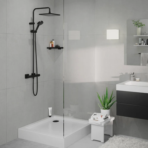 Wähle das Vernis Shape Duschsystem für dein Badezimmer und genieße jeden Tag ein luxuriöses Duscherlebnis, das nicht nur deinen Alltag bereichert, sondern auch dein Badezimmer in eine moderne Wohlfühloase verwandelt. Erlebe die perfekte Symbiose aus fortschrittlicher Technologie, Komfort und Design in deiner Dusche.