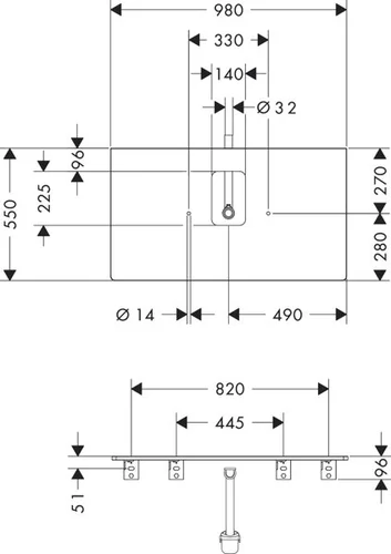 hansgrohe Xelu Q console met uitsparing in het midden, 980x550, voor opzetwastafel, met kraangat