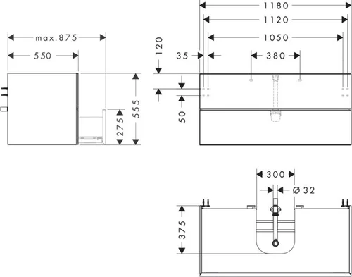 - Width: 1180 mm, depth: 550 mm, height: 555 mm