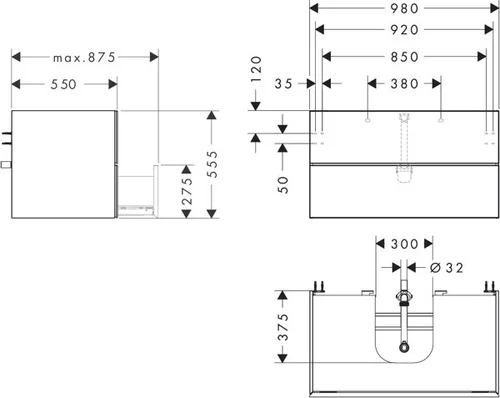 - Breedte: 980 mm, diepte: 550 mm, hoogte: 555 mm