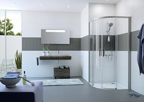 - Teilgerahmte Viertelkreis-Duschkabine mit zwei Gleittürsegmenten, je nach einer Seite öffnend, mit zwei festen Segmenten