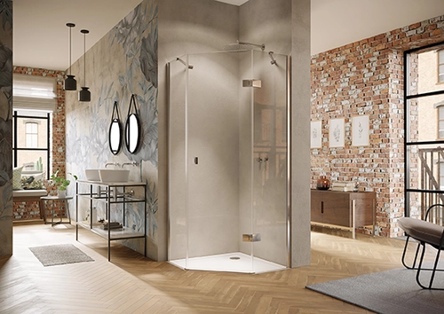 - Teilgerahmte Fünfeck-Duschkabine mit einem Glasflügel nach innen und auén öffnend