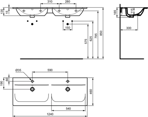 Ideal Standard Connect Air Möbeldoppelwaschtisch 1240mm, je 1 Hahnloch, mit Überlauf
