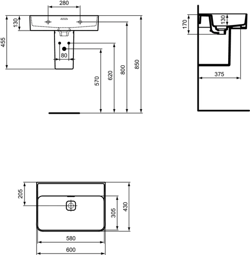 Ideal Standard Strada II lavabo 600 mm, senza foro per rubinetto, con sfioratore