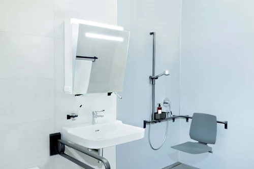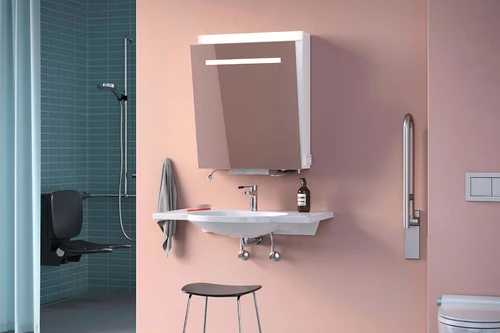 armadietto a specchio Schneider CARE LED, 595x727 mm, cerniera della porta a destra, illuminazione superiore, 2 prese di corrente esterne a sinistra in basso