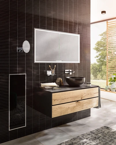 • Comando delle funzioni on/off, intensità luminosa, colore della luce (da 2.700 a 6.500 K) e selezione della scena (cosmetica, energizzante, rilassante) tramite app, controller o direttamente sul pannello di controllo touch.