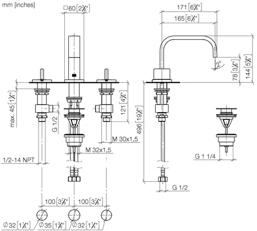 Dornbracht Miscelatore per lavabi a tre fori con set di scarico, sporgenza 165 mm