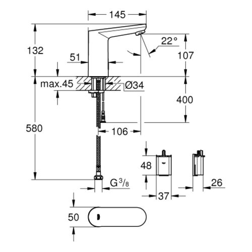 Elettronica a infrarossi Eurosmart CE per lavabi, taglia M, funzionamento a batteria, senza miscelatore, proiezione 106 mm