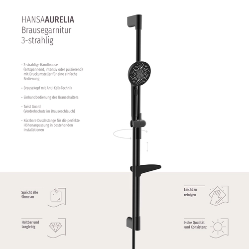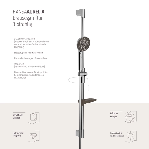 - composto da: doccia a mano, asta doccia, supporto asta doccia regolabile, portasapone, flessibile doccia (1750 mm), possibilità di installazione variabile, tecnologia anticalcare, protezione antitorsione, protezione antitorsione per flessibile doccia