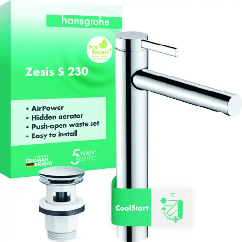 hansgrohe Zesis S miscelatore monocomando per lavabo 230 CoolStart per lavabi da appoggio, con scarico push-open, cromato