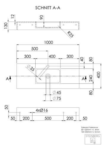 Lavabo a parete Steinberg Serie 444, 1000x400x130 mm, SOLIDSurface, 1 foro per rubinetto, senza sfioratore